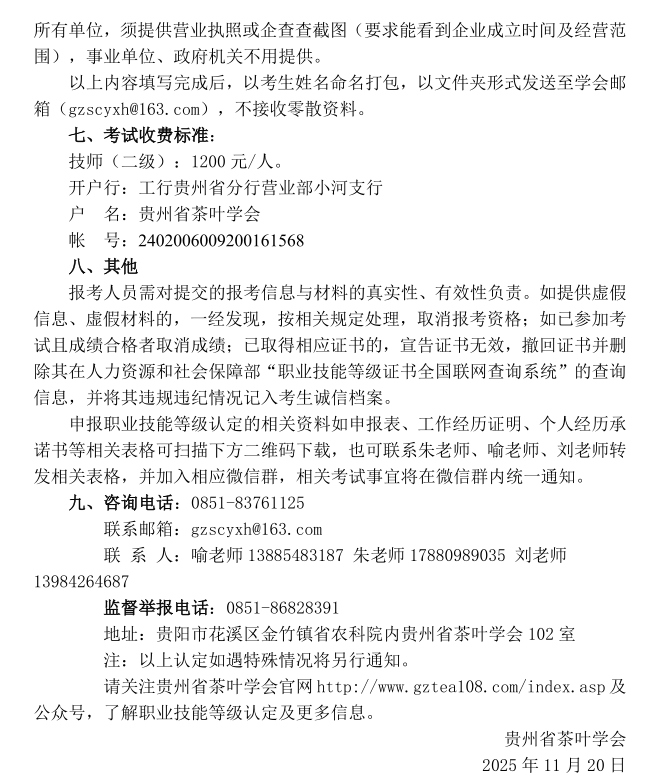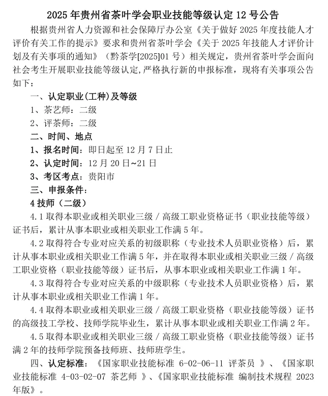 贵州省茶叶学会定于2025年12月20日在贵阳举办评茶师、茶艺师(二级)职业技能等级认定评价工作,报名截止时间12月7日。现将评价计划及有关事项通知如下,敬请关注。