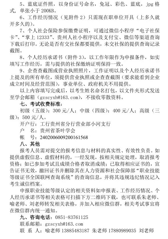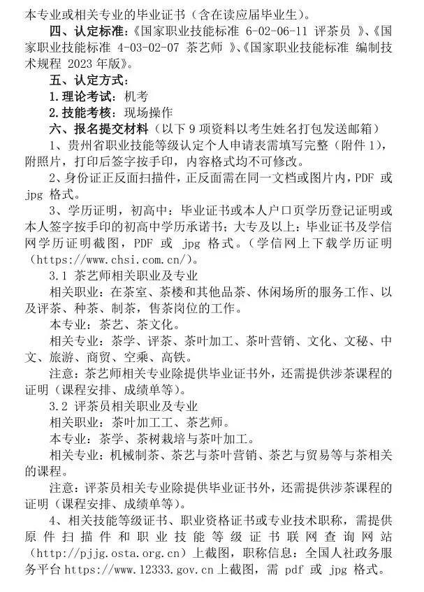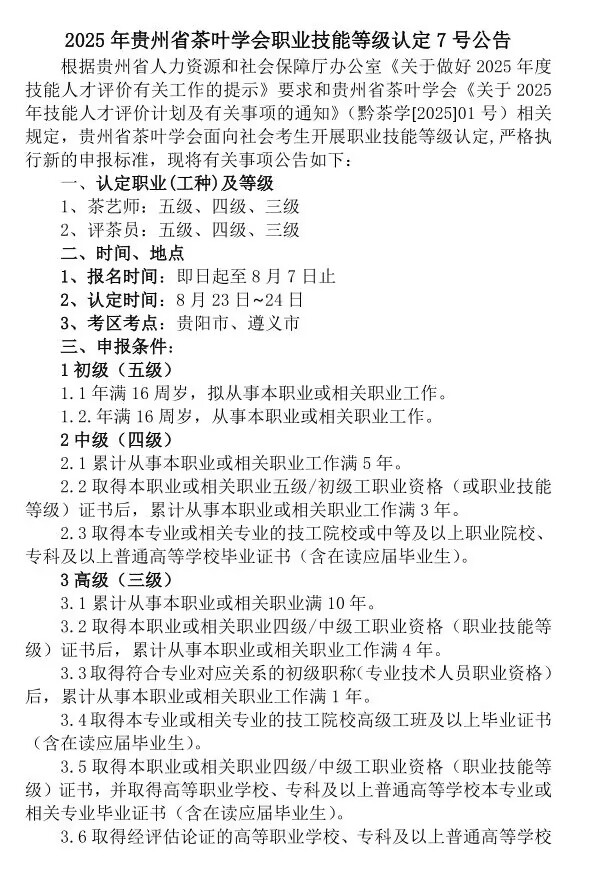 各 位茶仁: 贵州省茶叶学会定于2025年8月23日在贵阳举办评茶员、茶艺师(五、四、三级)职业技能等级认定评价工作,报名截止时间8月7日