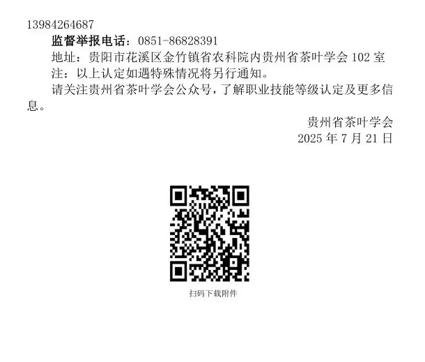 贵州省茶叶学会定于2025年8月23日在贵阳举办评茶员、茶艺师(五、四、三级)职业技能等级认定评价工作,报名截止时间8月7日。现将评价计划及有关事项通知如下,敬请关注。