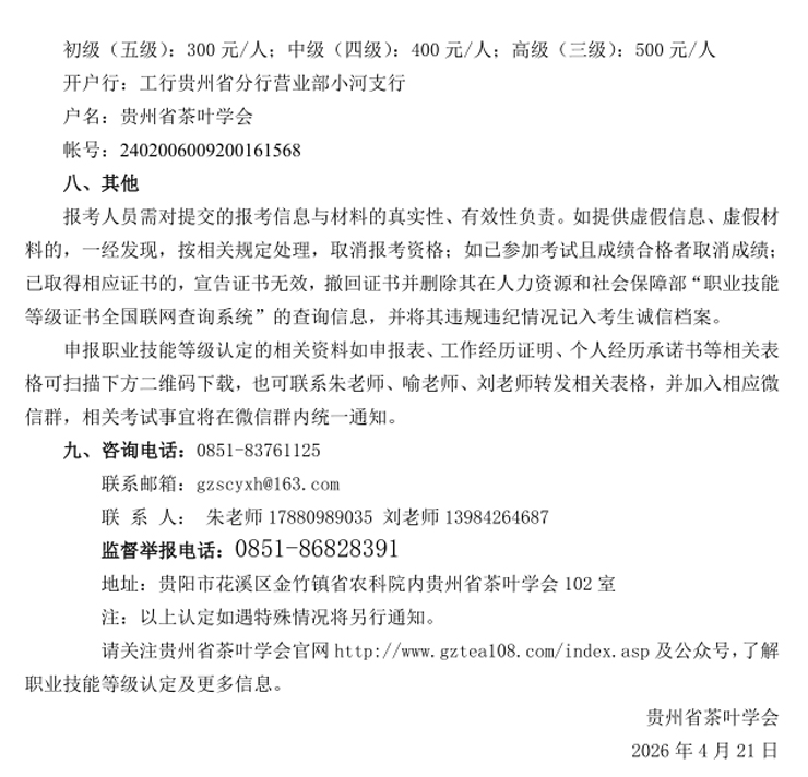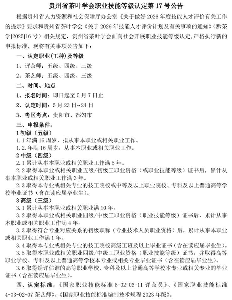 贵州省茶叶学会定于2026年5月23日在贵阳市,5月24日在都匀市。举办评茶师、茶艺师(五、四、三级)职业技能等级认定评价工作,报名截止时间5月7日。现将评价计划及有关事项通知如下,敬请关注。
