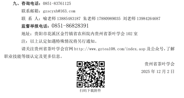 各位茶仁:贵州省茶叶学会定于2025年12月20日-21日在贵阳举办评茶师、茶艺师(五、四、三、二级)职业技能等级认定评价工作。现将评价计划及有关事项通知如下,敬请关注。