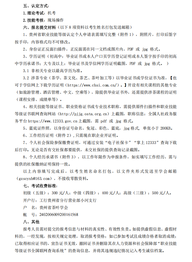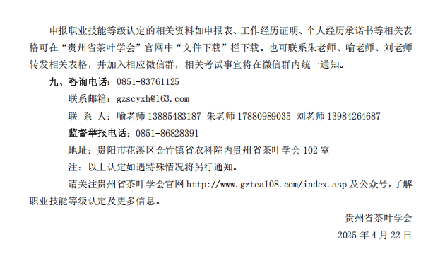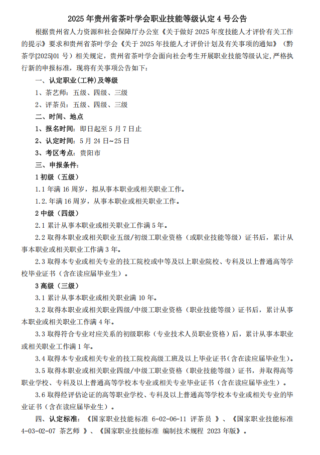 各位茶仁:贵州省茶叶学会定于2025年5月24日在贵阳举办评茶师、茶艺师(初、中、高级)职业技能等级认定评价工作,报名截止时间5月7日。现将评价计划及有关事项通知如下,敬请关注。