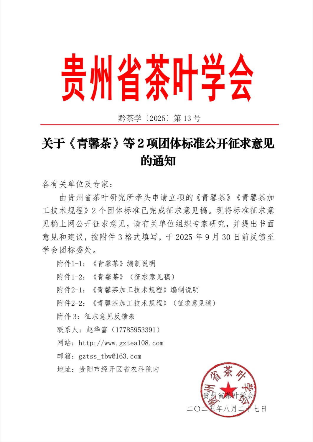 关于《青馨茶》等2项团体标准公开征求意见的通知