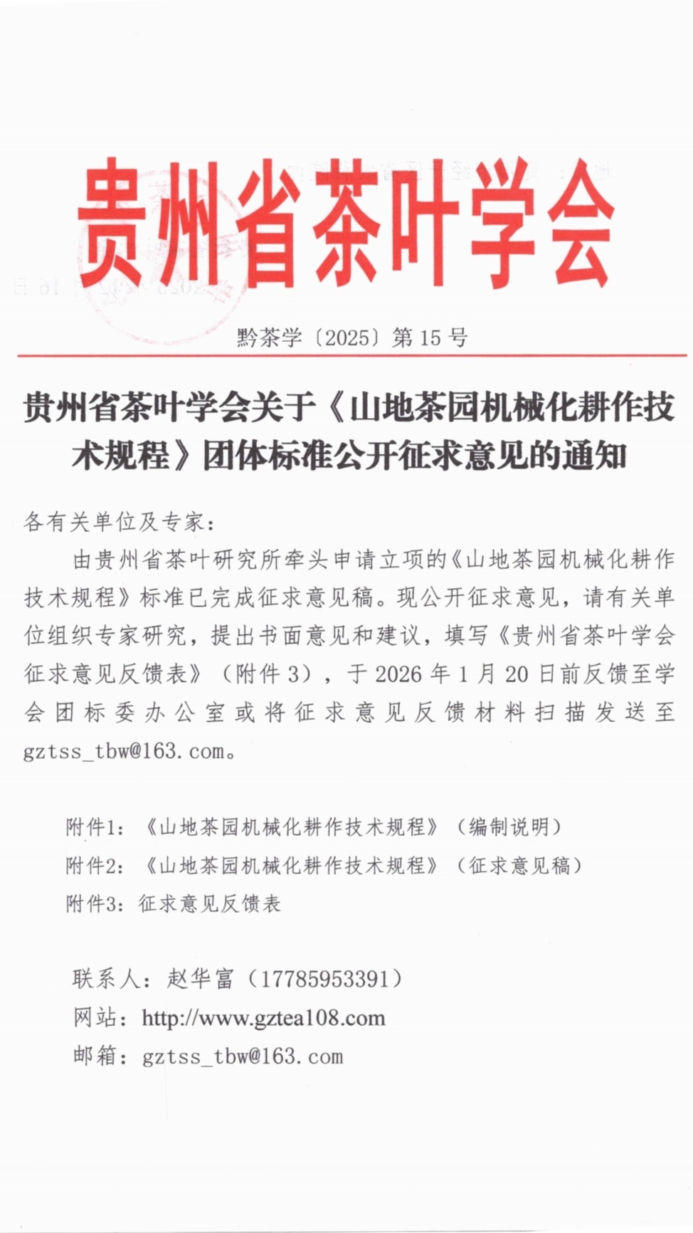 贵州省茶叶学会|关于《山地茶园机械化耕作技术规程》团体标准公开征求意见的通知